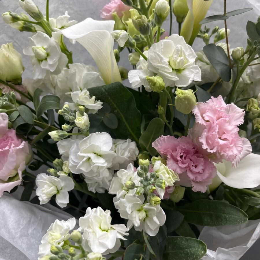 На фото букет «королевский акцент». В составе: калла 3 шт, эустома (лизиантус) 3 шт, маттиола 5 шт, эвкалипт 1 шт, дизайнерская упаковка 2 шт, атласная лента 1 шт, . Все цветы свежие и ароматные, букет красиво оформлен и отлично подходит для подарка. Доступна доставка цветов или самовывоз.